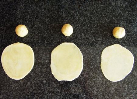 Nobody seems to know the secret of lukewarm water in making Indian bread. Pauline told me that if one uses warm water the dough is softer and fluffier. She showed me how to make small balls out of the dough and roll them on a pastry board with rolling pin. When I tried to do this all of my puris became maps of many countries. None had the perfect shape of the earth as Pauline could create time after time.